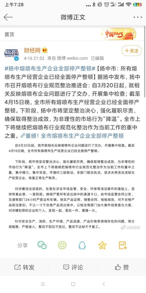 真正讓熔噴布大幅降價(jià),扭轉(zhuǎn)熔噴布地下小作坊的亂象,還是需要市場(chǎng)的力量,比如中石油、中石化等國(guó)企大廠開始大量出貨,價(jià)格降下來了,沒有了暴利誘惑,小作坊的生產(chǎn)自然停息。