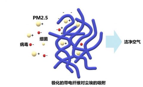 通常在熔噴布的生產(chǎn)過程中會(huì)駐極處理,讓無紡布帶上更多靜電,具有靜電吸附作用。靜電吸附是指當(dāng)過濾材料的纖維帶電時(shí),通過荷電纖維的庫侖力實(shí)現(xiàn)對(duì)粉塵細(xì)菌病毒的捕獲。