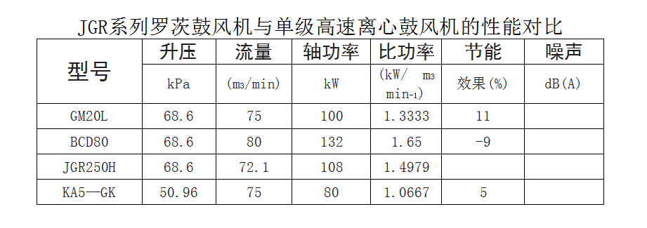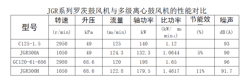 (1)現在有許多設計院及高等院校在污水處理系統設計時常采用多級離心鼓風機,認為多級離心鼓風機能耗及噪聲都比羅茨鼓風機低,甚至有關領導部門曾想在污水處理系統中淘汰羅茨鼓風機。其實我國的羅茨鼓風機設計制造技術在近20年來已有了長足進步,特別JGR系列羅茨鼓風機設計制造成功并批量投產,其各項指標特別是噪聲及能耗指標有了大幅度下降,絲毫不遜于多級離心式鼓風機,JGR系列羅茨鼓風機與多級離心鼓風機的性能對比如下表: