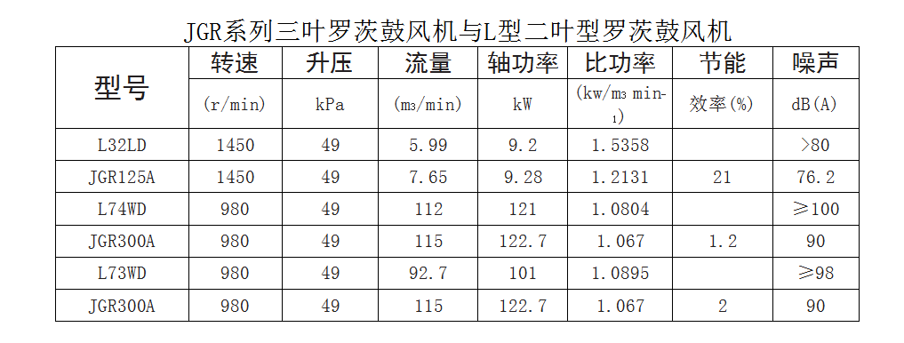 (3)JGR三葉羅茨鼓風機與L型二葉型羅茨鼓風機及國外三葉型羅茨鼓風機的性能對比:L型二葉羅茨鼓風機是80年代中期,當時的機械工業部組織全國幾家重點羅茨鼓風機生產廠家聯合設計的節能產品,列入國家第八批節能產品目錄,JGR型三葉羅茨鼓風機是山東錦工有限公司自主研發的產品,兩種產品的性能對比如下表。
