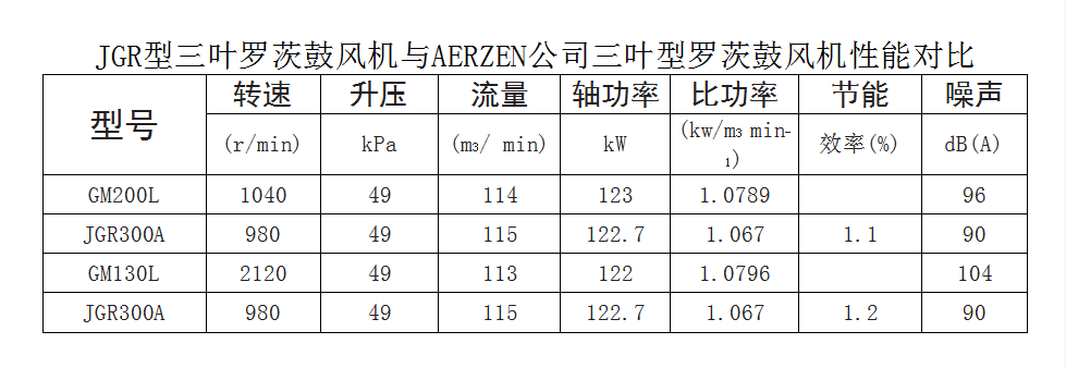 從上表中可看出JGR300A三葉型羅茨鼓風機的能耗要較世界王牌德國AERZEN公司GM型三葉羅茨鼓風機低1%以上。