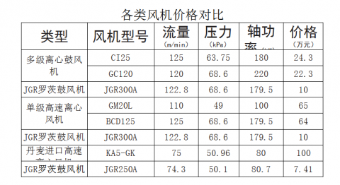 各類風機價格對比如上表所示。從上表可看出JGR系列三葉型羅茨鼓風機的價格是多級離心鼓風機的1/2不到;是國產單級高速離心鼓風機的1/5不到;是進口單級高速離心鼓風機的1/12不到,因而在價格上JGR系列羅茨鼓風機有絕對的優勢。